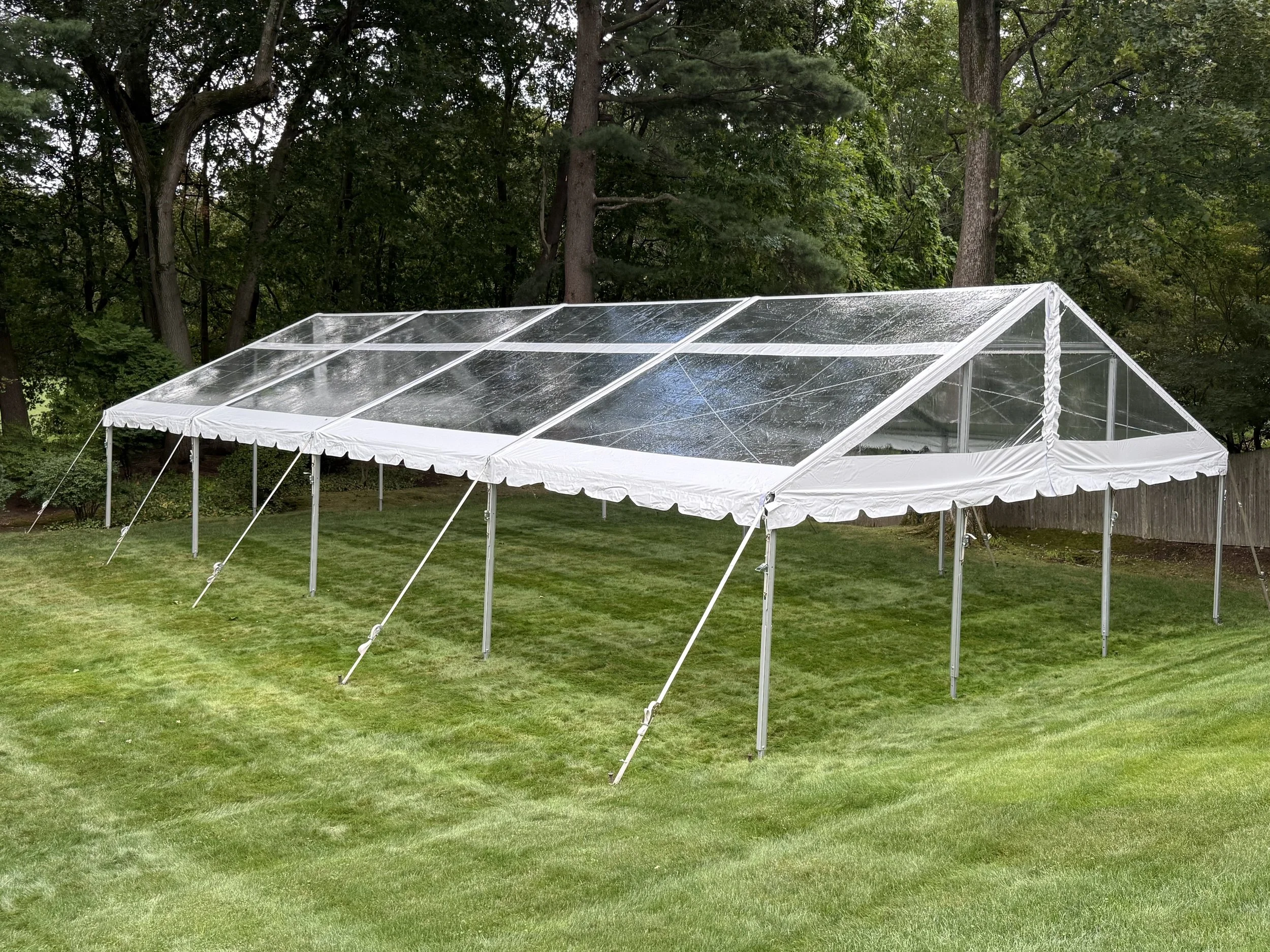 All of our tents are engineered, and use flame retardant vinyl. Our white top tents use block-out vinyl which not only protects your guests from rain, but provides much needed protection from the sun on hot days too. All of our tent prices include professional installation and removal by our staff.